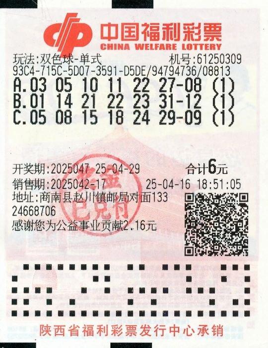 4月29日,福彩双色球第2025047期开奖,开出一等奖4注,商洛彩民6元单式票守中千万大奖。