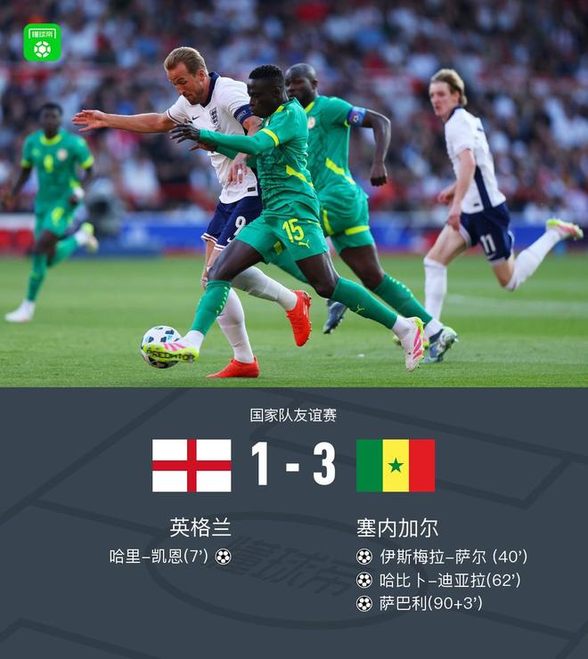 北京时间6月11日国家队友谊赛,英格兰对阵塞内加尔。英格兰哈里-凯恩破门。塞内加尔伊斯梅拉-萨尔 破门,哈比卜-迪亚拉破门,萨巴利破门。最终比分英格兰 1–3 塞内加尔。