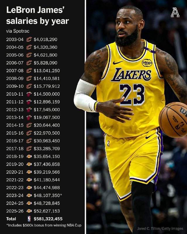 据Spotrac数据公司统计,詹姆斯在选择执行2025-26赛季球员选项之后,职业生涯的收入即将突破6亿美元大关。