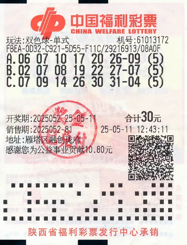 5月11日晚,福彩双色球游戏第2025052期开奖,开出红球号码06、07、10、17、20、26,蓝球号码09;当期全国中出一等奖27注,单注奖金552.0724万元;其中5注,全部出在陕西省西安市。