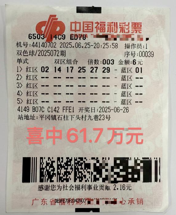 6月26日,中国福利彩票双色球第2025072期开奖,当期全国共中出一等奖8注、二等奖121注。其中3注二等奖花落阳江市平冈镇石柱下头村九巷23号的44140702福彩销售站点,幸运彩民王先生(化名)凭借一张6元的单式3倍投注彩票,收获中奖奖金61.7万元。