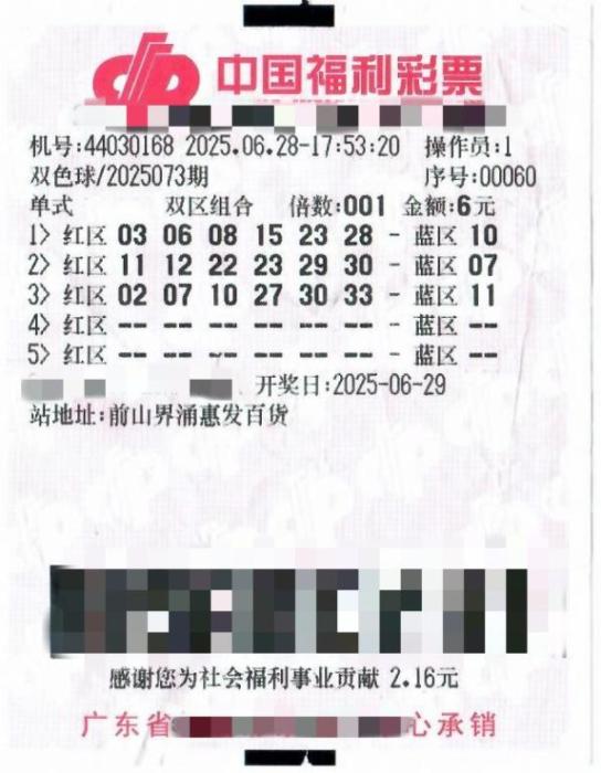 2025年6月29日,中国福利彩票双色球第2025073期开奖,当期全国共中出一等奖19注,其中1注花落珠海市香洲区前山界涌44030168福彩销售站点。中奖彩票是一张1倍3注单式彩票,中奖奖金591万元。