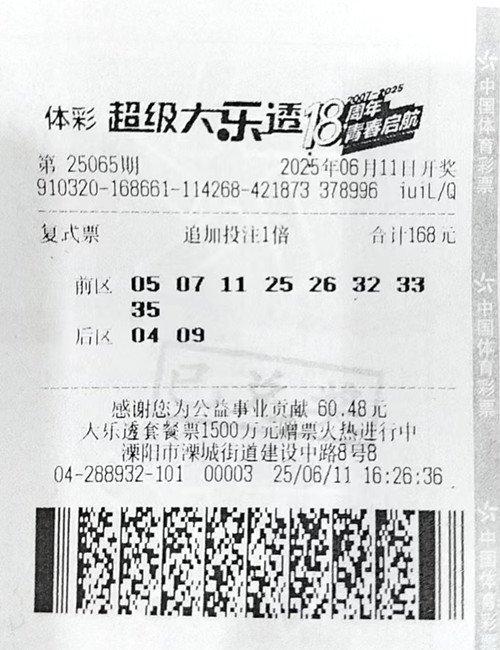 不过幸运也很快和张先生不期而遇。6月11日傍晚的时候,他来到常州溧阳市3204288932体彩网点,打了一张“8+2”复式追加票,其中前区号码为“05、07、11、25、26、32、33、35”,后区号码为“04、09”。当晚,大乐透第25065期开奖,开奖号码为“07、25、32、33、35+04、09”,他除了中出1注追加投注一等奖,还中出15注四等奖、30注六等奖、10注八等奖,总奖金达到18051150元。