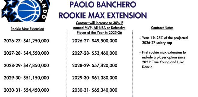 随后,NBA薪金专家Marks公布了班凯罗未来5年的具体薪水——基础薪资为5年2.39亿:首赛季2026-27赛季为4125万、最后一个赛季2030-31赛季则为5445万;若班凯罗在2025-26赛季当选MVP、入选最佳阵容或获得最佳防守球员,合同将自动升级至5年2.87亿美金。