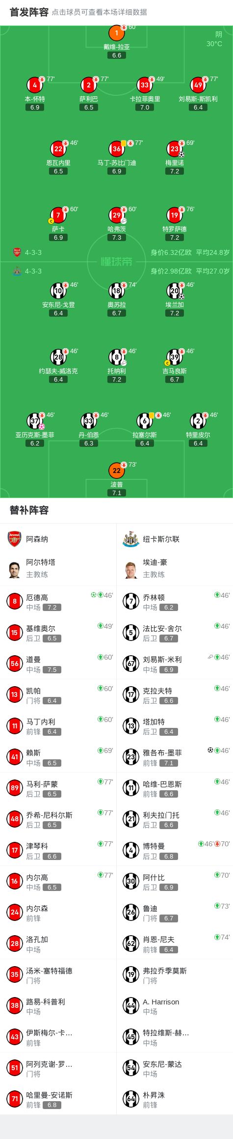 第33分钟,哈弗茨脚后跟传球,梅里诺推射破门扳平比分,阿森纳1-1纽卡