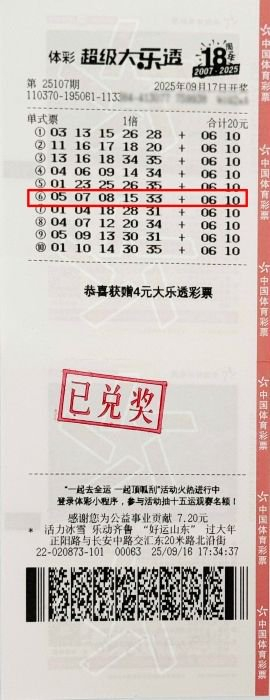 09月17日,大乐透第25107期开奖,前区号码为05、07、08、15、33,后区号码为06、10,全国中出一等奖7注,每注1000万。临沂购彩者中得一等奖1注,奖金1000万。