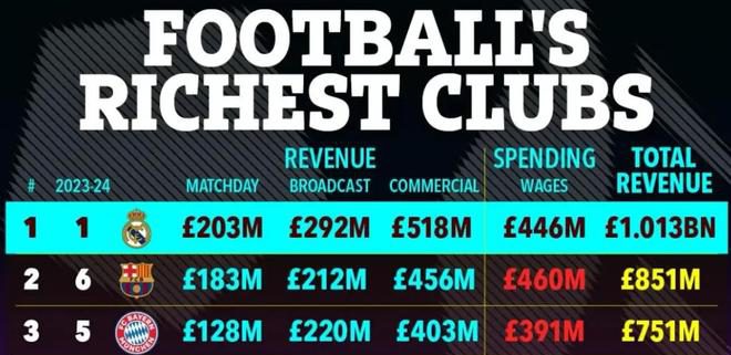德勤最新足球财富榜显示,皇家马德里以约10.1亿英镑营收领跑;英超豪门座次也出现变化。