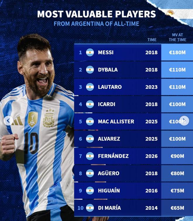 阿根廷球员历史身价榜显示,梅西在2018年达到1.8亿欧元,形成显著领先。